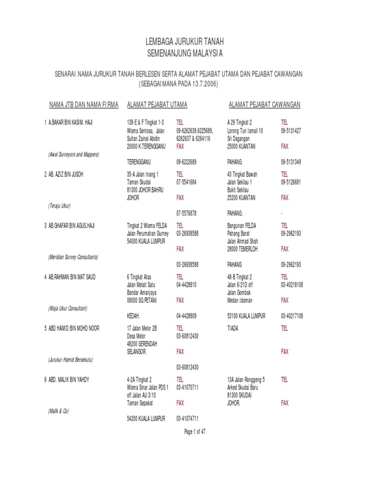 Check out variant for lembaga jurukur tanah abbreviation in malaysia. Pentauliahan praktis dikeluarkan oleh lembaga juruukur tanah semenanjung malaysia. Jurukur perlu mendaftarkan firmanya dengan lembaga jurukur tanah semenanjung malaysia (ljt) di bawah ordinan jubl 1958. Lembaga jurukur tanah semenanjung malaysia senarai nama jurukur tanah berlesen serta alamat pejabat utama dan pejabat cawangan (sebagaimana pada 13.7.2006) nama jtb dan nama firma 1 a.bakar bin kasim. Jurukur tanah yang dilesenkan dibawah akta 458 akta jurukur tanah berlesen 1958 (pindaan 1991)dibawah lembaga jurukur tanah semenanjung malaysia.